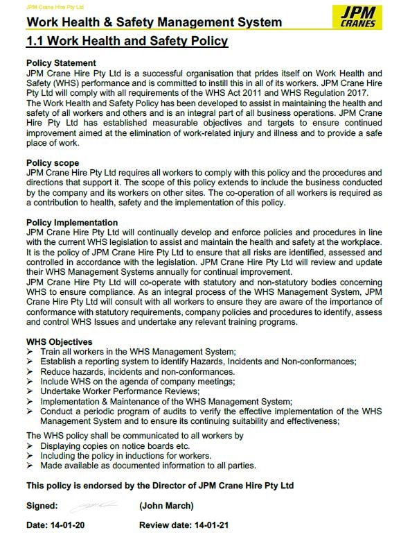JPM Crane Hire is committed to the fundamentals of Work, Health and Safety in the workplace, which combined with our core values, ensures a quality service in a safe and ethical manner.